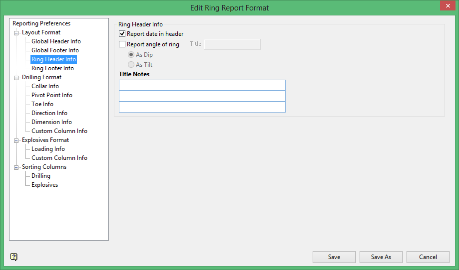 Select this check box to place the angle of the section into the header of the report. The vertical section can be reported as being 90 degrees ( As dip ), or as 0 degrees ( As tilt ).