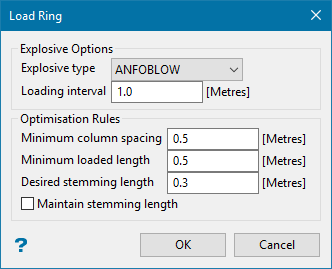 Enter the stemming length value preferred for the stemming of a hole. This value is used by the Load Ring option as part of the rules to optimise automatically a ring design.