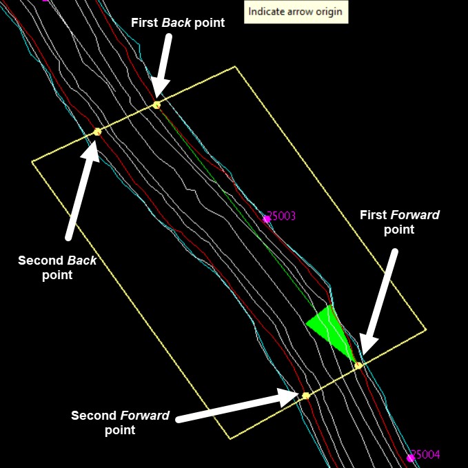 Once the floor or shoulder string has been selected the user will be prompted to digitse the first back point (i.e. the furthest point backwards from the survey station) on the selected floor/shoulder string, followed by the first forward point (i.e. the furthest point forwards from the survey station) on the same side of the selected string as the first back point.