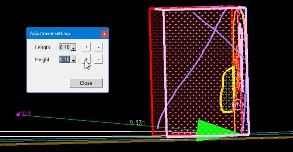 Allows the user to adjust the faces distance from the survey station and also the height, realtive to the original position. Once ‘Adjust dimensions’ has been selected the user will be presented with a floating panel that allows the adjustment of the faces distance from the reference survey station and also it’s height, relative to it’s current position. Each dimension can be adjusted by increments selected from the drop-down list and using the ‘+’ or ‘-‘ buttons to shift the face away from (‘+’) or towards (‘-‘) the survey station and up (‘+’) or down (‘-‘) relative to it’s current position.