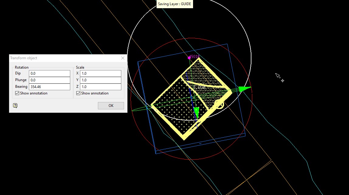 When the face is selected, three circles, centred on the middle of the objects extents, and a cube are displayed. The red circle represents the bearing, blue the plunge and green the dip. The Transform Object panel is also displayed.