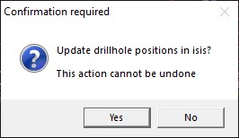 ‘DesignToActual’ panel. A pop-up prompt will appear asking for confirmation of moving the position of the sample line(s) in the samples.face.isis drillhole database – this is imporant, as this process cannot be undone. If an error has been made ‘no’ can be selected and the adjustments to the face mapping polygons can be undone by using Design > Undo in Vulcan.