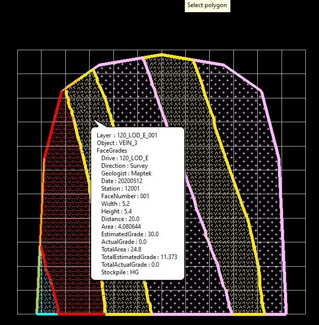 Once finished digitising right-click to close the polygon to flag the selected points with the point name concatenated from the selected domain and “HW” or “FW” (for hanging wall or foot wall, respectively). If happy with the points flagged on screen select ‘Yes’, otherwise selecting ‘No’ will not flag any points and quit the tool.
