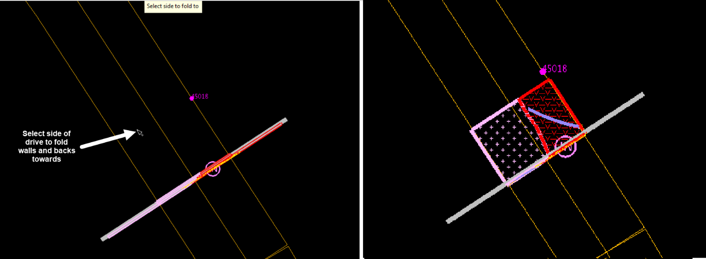 Toggle out of section view and back into plan view. Select (click, using Snap to Object) the face to fold, then select the side of the face to fold the walls and backs polygons towards.