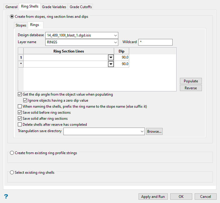 Choose this option to create ring shells from both stope triangulations and blast rings. Both Rings and Stopes windows must be completed.