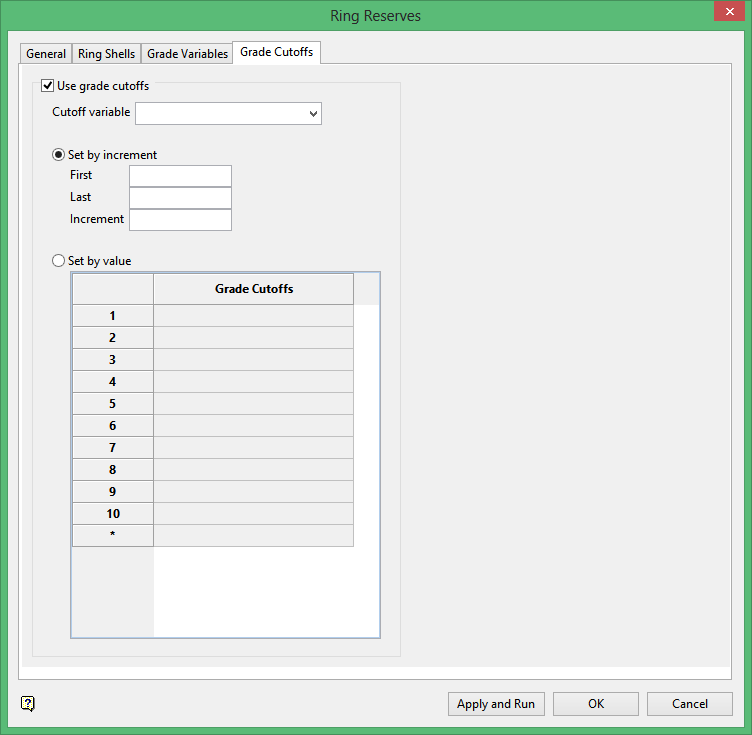 In the Grade Cutoffs panel (if not using an Advanced Reserves specification), configure the grade cutoff variable.