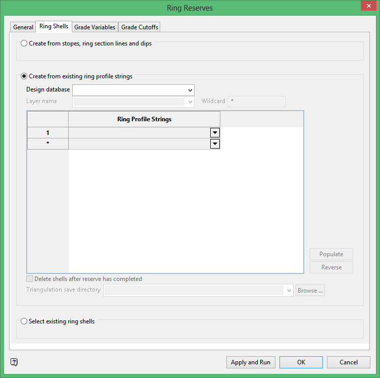 Use this option to calculate ring reserves based on ring profiles. Ring profiles strings are polygons or polygon-like strings representing a slice of the stope. For more information on creating ring profiles, see Create Ring Profiles.