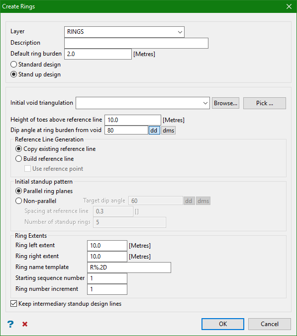 Select Stand up design to create a set of rings of varying dump sizes (that is, dip angles). Stand up rings are typically used in up hole and slash hole mining. The type of stand up design created depends on mining requirements.