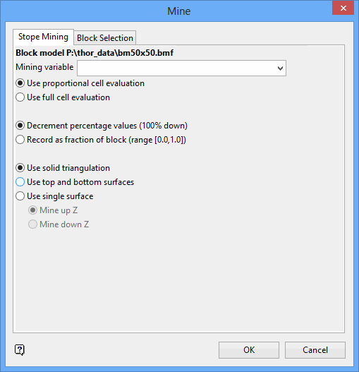 Select this option to report on the percentage or fraction of a block that falls above or below a nominated surface triangulation. You will be required to select the necessary triangulation after completing this panel.