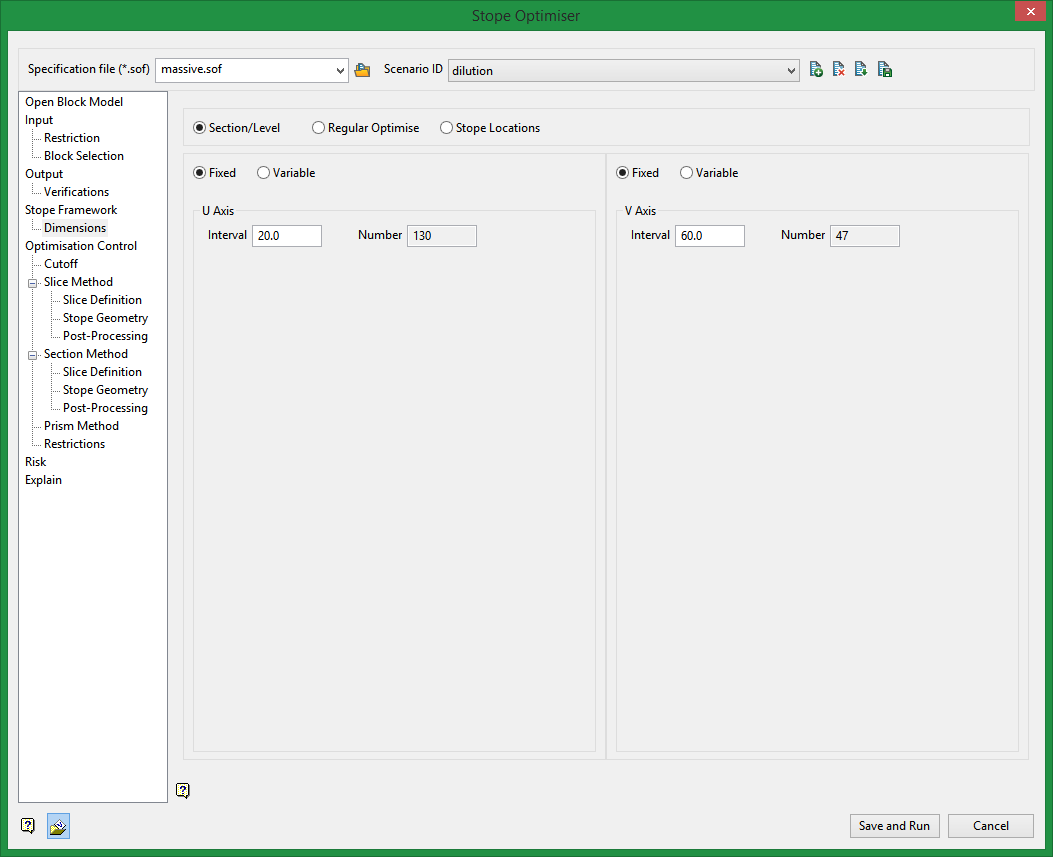On the Underground menu, point to Analyse, click Stope Optimiser, and then select Dimensions from the tree menu on the left to display the Dimensions pane.