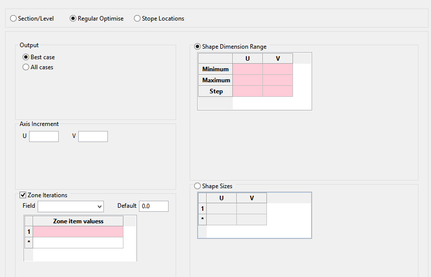 Define the step size for each axis. The step size should be a sub-multiple of the (maximum - minimum) stope size. The step will be used as the interval to determine the optimal stope size.