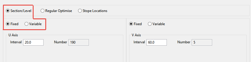 The Stope Locations method uses one of two user specified methods for defining stope locations. Both methods use U and V axes to define stope locations and shapes. The U axis corresponds with the first axis of your stope orientation plane. The V axis corresponds with your second axis of the stope orientation plane.
