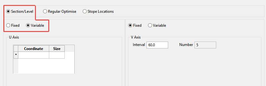 If you selected XZ as the Stope orientation plane, a U axis with a coordinate of 74000 and a size of 20, the result would be that only stopes along the 74000 easting would be created. Additionally those stopes would have a dimension of 20 in the X direction.
