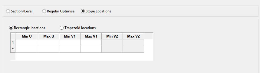 This method uses minimum and maximum U and V coordinates to define stope positions. If you have selected an XZ stope orientation plane the U axis corresponds to the X axis and the V axis corresponds to the Z axis. Multiple rows can be specified to define the various stope locations
