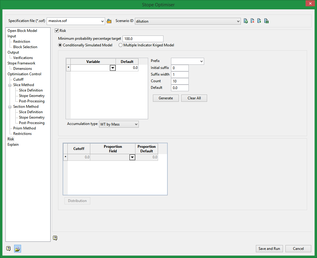 On the Underground menu, point to Analyse, click Stope Optimiser, and then select Risk from the tree menu on the left.