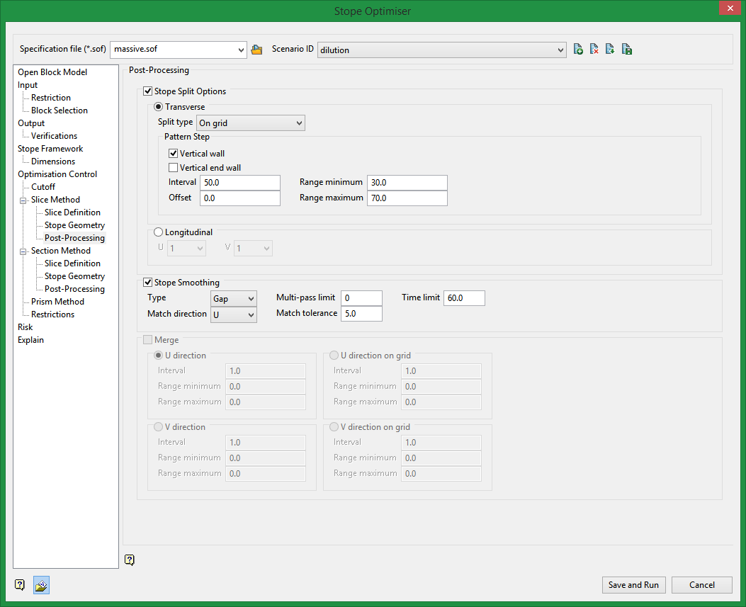 On the Underground menu, point to Analyse, click Stope Optimiser, then select Slice Method > Post-Processing from the tree menu on the left.
