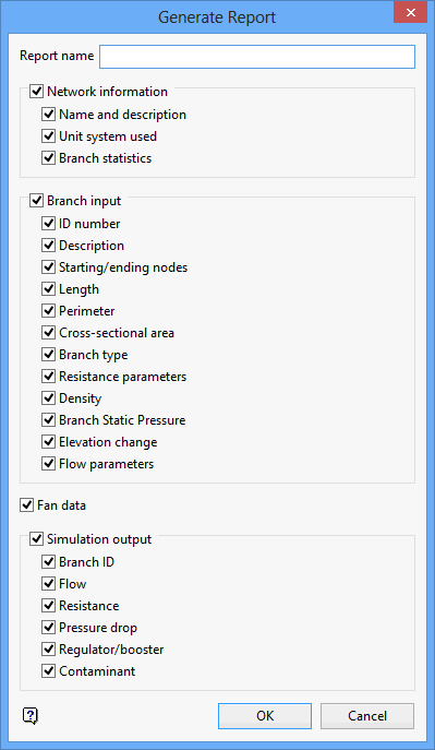 Use Report to report on the network's input and output parameters. The reported information will be saved to a CSV file, with a separate file being created for each section chosen, that is, network information, branch input, fan data, and simulation output.