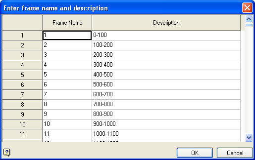 Enter the names of the frames that you want included in the animation. The order the frames appear in this list is the order in which the animation will be played. Only actors that have frames included in this list will be used. The maximum size is 20 alphanumeric characters.