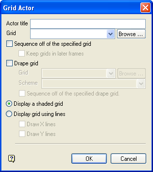 Enter or select either the full grid file identifier (.gfi) of the display grid or the prefix for a sequence of display grids (for example, pit_). Click Browse to select a file from another location. If you are specifying a sequence prefix, there is no need to enter a wildcard (for example, pit_* is not valid for sequences).