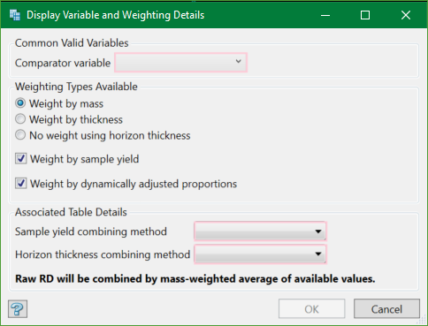 Mass will be computed as (horizon-thickness x raw RD) for each contributing table. Where a specific RD value has not been assigned to a table, a raw RD value will be calculated as an approximation from the table's fraction densities and yields.