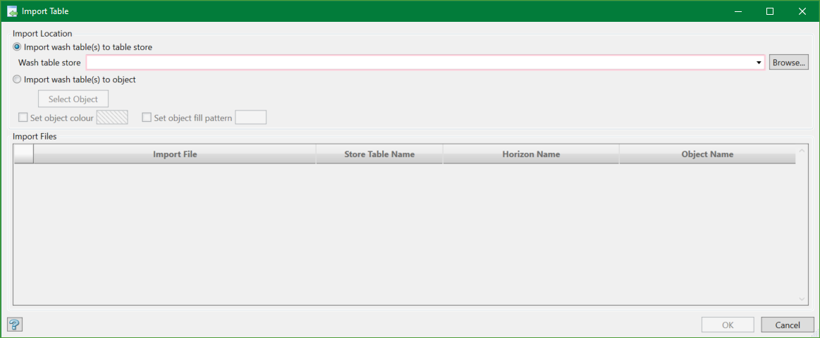 Choose a wash table store name from the drop-down list or browse from other directory. This will enable all the columns of the data-grid of the panel to allow the selection of CSV files needed. Supply the table name, horizon name, and the object name associated with the imported table. If the source table selected is a complete report table, these details will be filled automatically. However, they can be edited if needed.