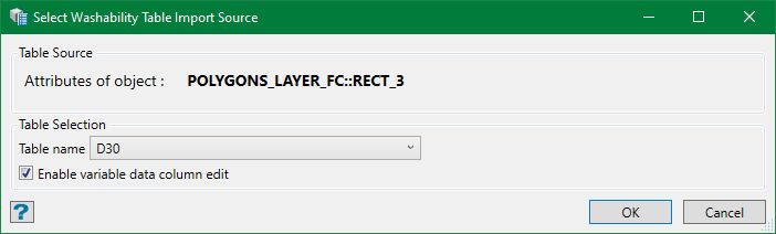 After selecting one of these wash table sources, hit OK and the Report from Washability Table panel is displayed with table data prefilled based on the source selected. This panel is same for all the wash table sources.