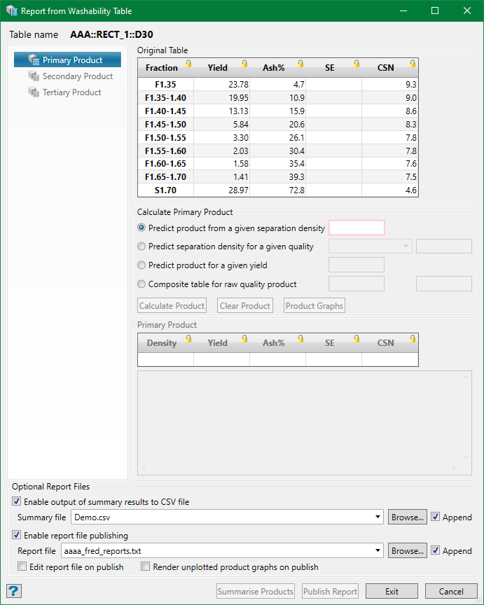 Once you choose of the above options, th is button is enabled. Click on the button to produce the primary product report. An example with a separation density of 1.4 is shown below.