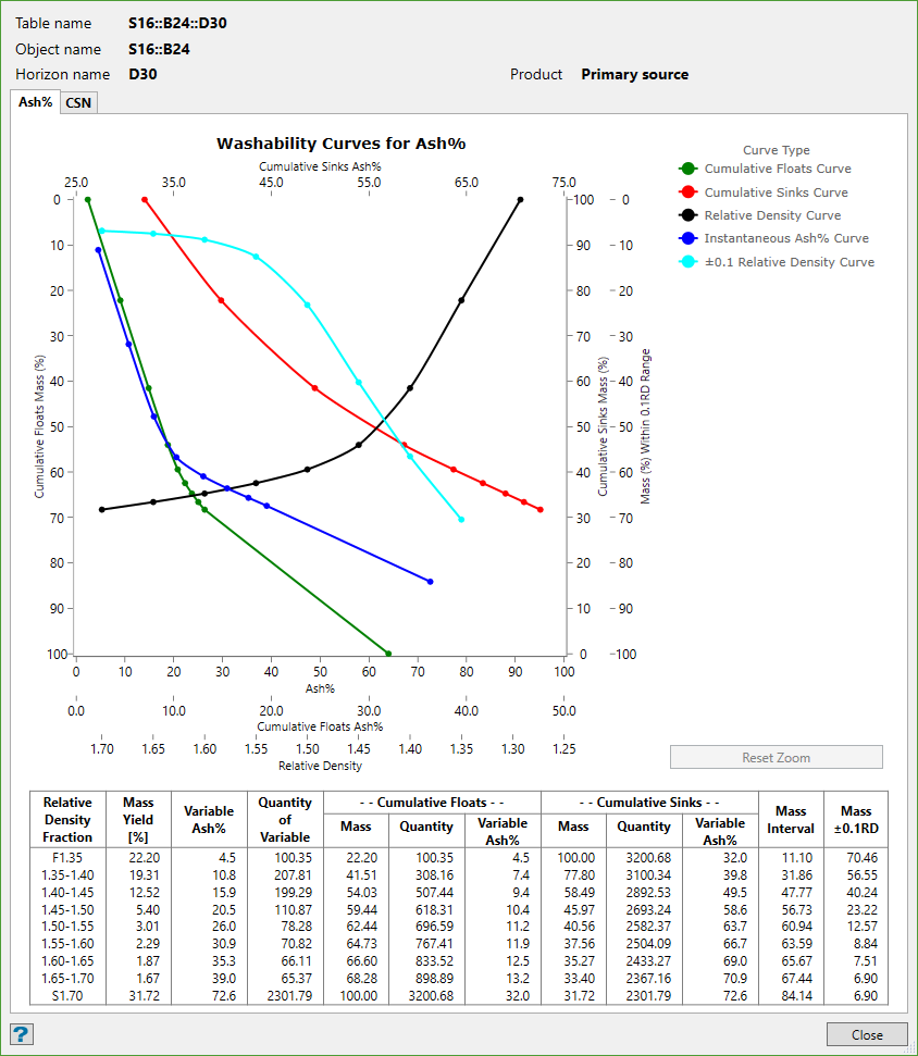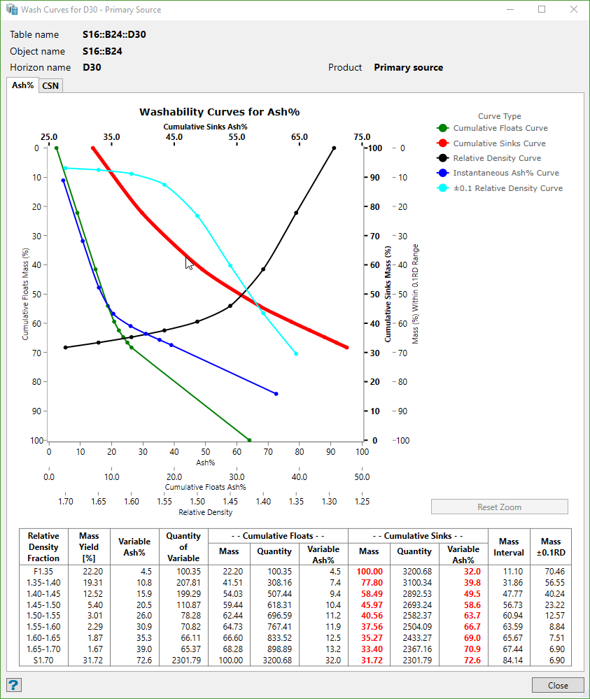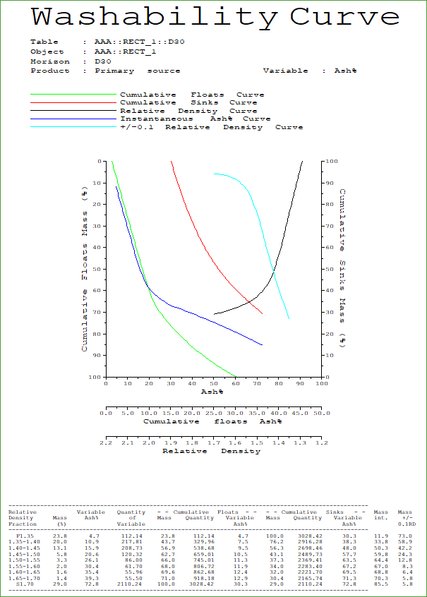 By default, the appearance of the product graphs will be the new Maptek Chart style Washability Curve graphs. You can also add username and date stamp to these graphs if you need to print them.