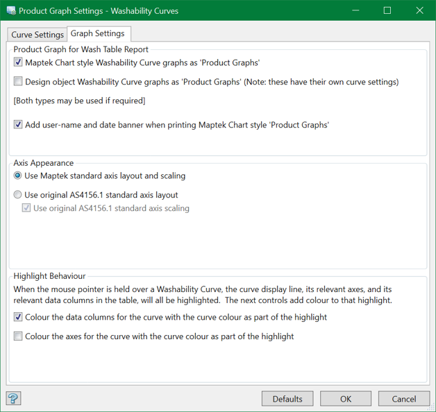 When the mouse pointer is hovered over a washability curve, the curve line, its relevant axes and data columns in the table will be highlighted. You can also match the axes and data columns' colours with the curve colour by selecting the respective checkboxes.