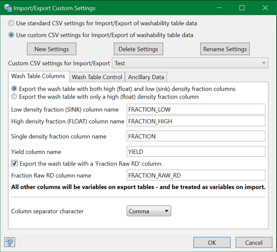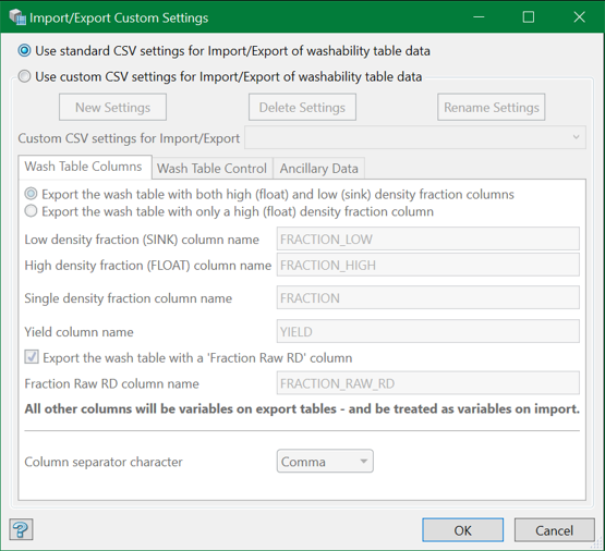 Use this option to define the standard and custom settings required for importing or exporting Washability tables.