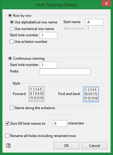 Select the Use echelon hole naming check box if you want to adjust the hole numbering for the rows so that the numbers follow echelons. If this check box is checked, then the holes will be named according to the hole name located in the row diagonally above, in an oblique or step-like formation.