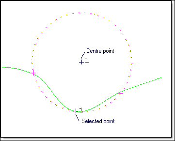 The indicated point must not be an end point of an open object. The selected point is then assigned a sequence number, and the radius and centre point of the curvature displays through a popup window. The centre point is also shown graphically (+) as an underlay.