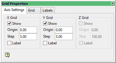 Use the Apply option to display a grid. You can specify the type of grid; XY Plane, XZ Plane, YZ Plane, Screen Plane, Primary Plane and 3D; the colour and the opacity of the grid display (that is, how solid the grid appears on the screen); whether to snap to visible grid lines or to the actual intervals; the origin and step size for the grid; and whether to label the grid.