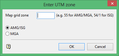 Enter the UTM zone. For AMG/MGA grids the zone is entered as an integer (between 49 and 56). For ISG, the zone is in two parts, separated by a forward slash. The first part is an integer as per AMG, the second part is 1, 2 or 3. For New South Wales, valid values are 54/2 to 56/2.