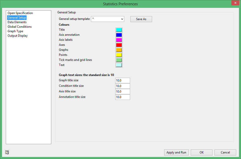 Enter the name of the template to save to. The current state of the General Setup section (that is, all colours and graph text sizes) can be saved to a template. Select the Save As button to save the template.