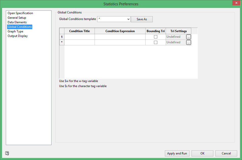 Tip: Use $w for the W tag variable and $s for the character tag variable to set the condition on multiple datasets. When a drillhole database is used to run advanced statistics it is not possible to limit the data by a condition in a field located in a different table. For example: Run a general stats in ASSAY:AU limit by GEOL:LITH field.
