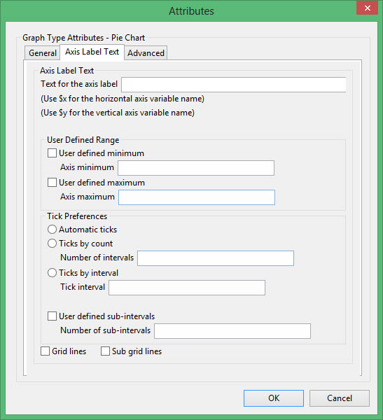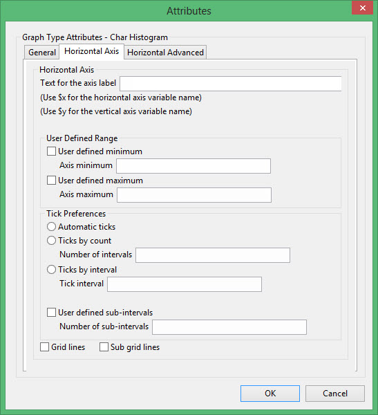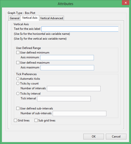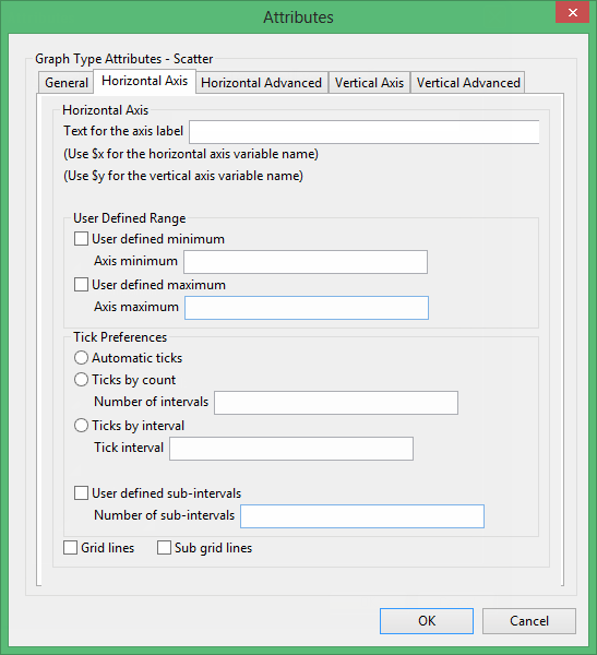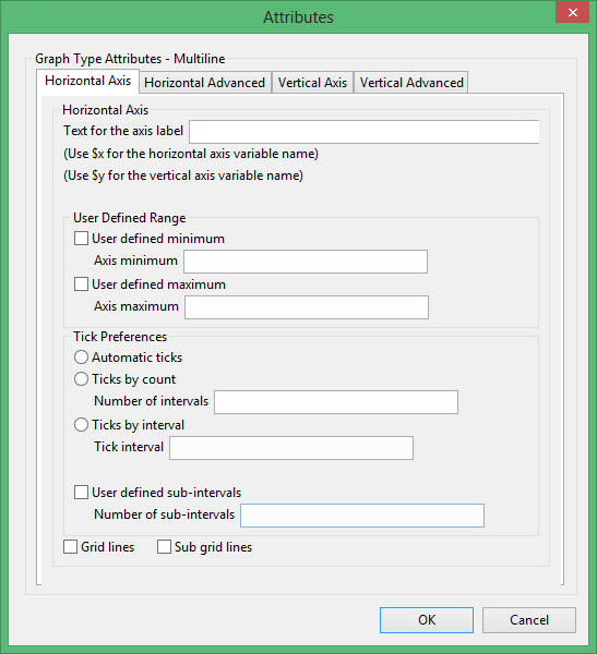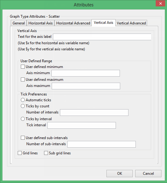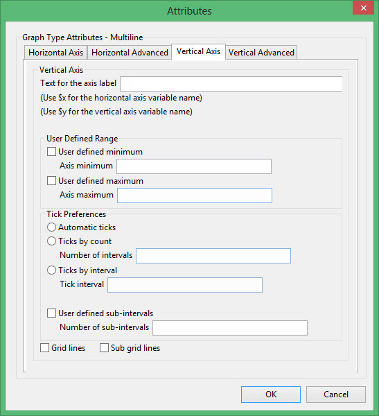 Enter the axis title (a maximum size of 40 alphanumeric characters). $x can be used for the horizontal axis variable name, while $y can be used for the vertical axis variable name.