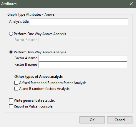 Specify whether you want to perform One-Way ANOVA analysis or Two-Way ANOVA analysis. You will need to identify the factors used. When performing Two-Way ANOVA analysis, you will have the ability to nominate whether the factors are to be fixed or random.