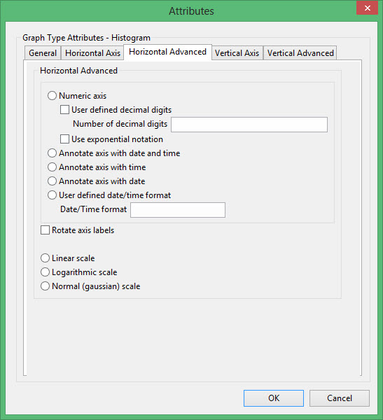 This plot type generates a histogram of the data selected. Options exist for linear, log and normal Gaussian scales on both the X and Y-axis.