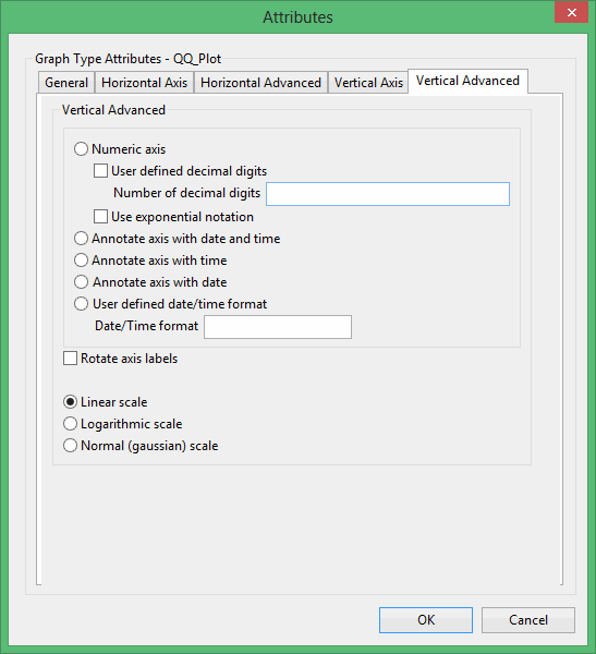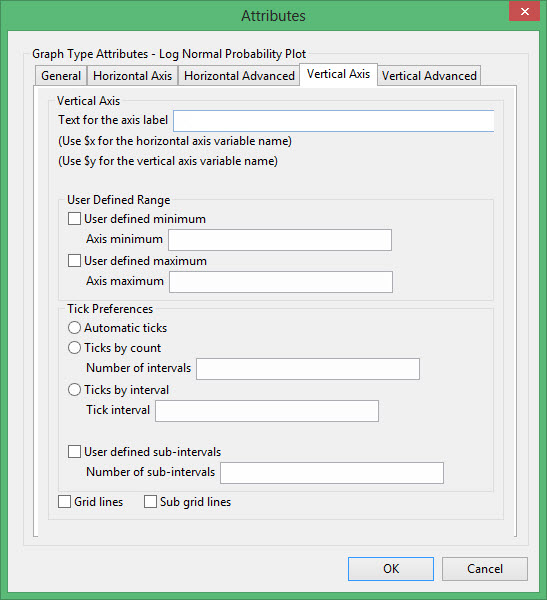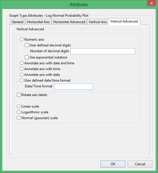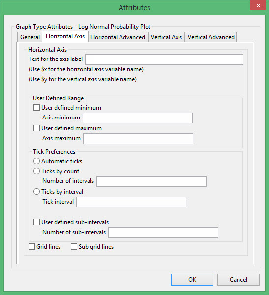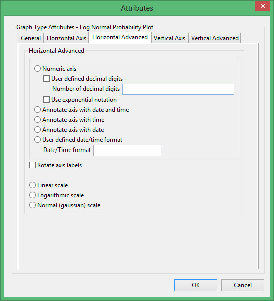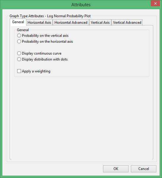 This plot type produces a graph comparing a distribution with a log normal distribution. It is similar to Cumulative except that the X-axis is LOG scale and the Y-axis is Gaussian (log-normal) scale. If the graph is a straight line, then the distribution is said to be log-normal. The probabilitY-axis is displayed in units of standard deviation and labelled in units from 0 to 1.