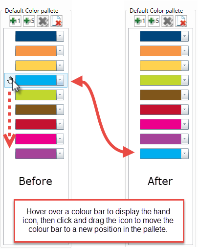 Reposition a colour bar by highlighting the bar to display the hand icon, then dragging the colour bar to the desired position.