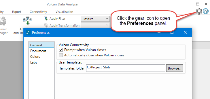 Prompt when Vulcan closes - Selecting this option gives you the option to continue working with the Data Analyser after the main Vulcan program has closed.