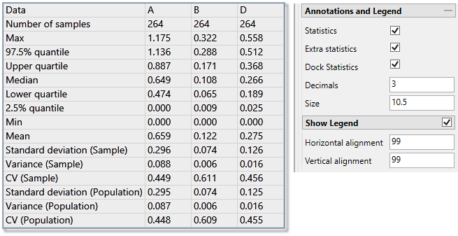 You can display annotations and legends (which are turned off by default) by enabling the Statistics and Show Legend checkboxes. Enabling the Dock Statistics option will position the table below the chart.