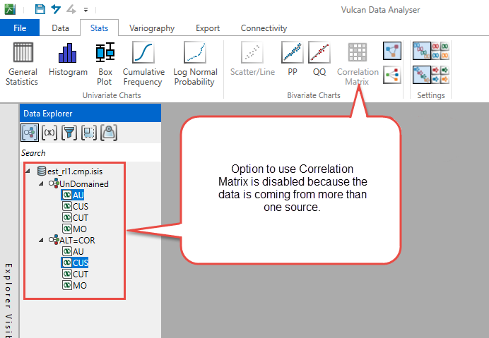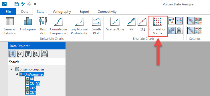 Select the variables you want to analyse, then click Correlation Matrix on the Stats tab. A chart will be created and displayed in the Chart Window.