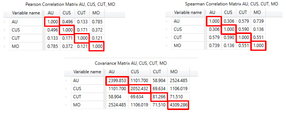Use this option to see the correlation between multiple variables. It allows for Pearson and Spearman correlation, and also allows for covariance analysis.