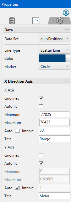 Option Result Data Set Select the dataset that the chart will reference. Line Type Select a line style. Colour Select the colour scheme. Marker Select the shape of the points displayed in the chart. Gridlines Display gridlines for either the X or Y direction. Auto fit Select this option for the axes to be automatically set up based on the values found in the data.