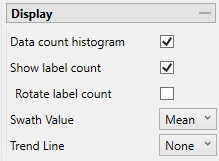 Option Result Data count histogram Display a histogram on the swath plot reflecting the values. Show label count Label each bin of the histogram. Rotate label count Rotate the labels vertically. Swath Value Select the type of evaluation. Trend Line Select the type of trend line. -