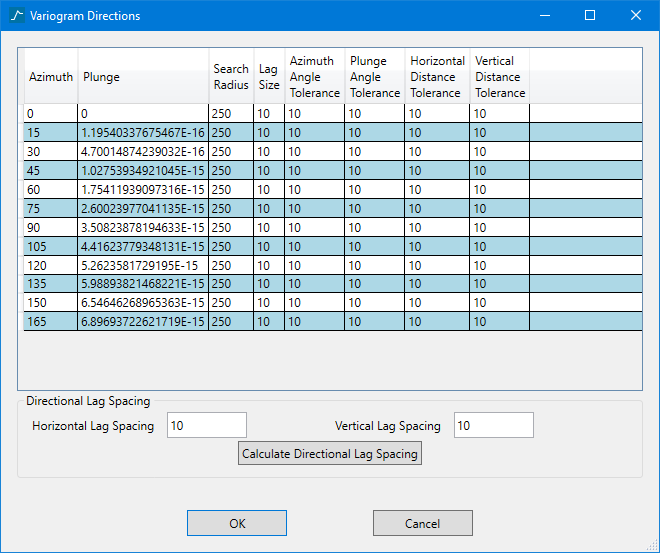 Directional Parameters allows you to set different lag and tolerance parameters for each variogram individually. To use the same lag and tolerance parameters for all variograms, see Constant Parameters above.