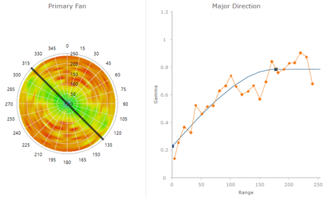 It is possible to select a separate colour for each variogram by selecting the data set from the drop-down list in Data Set, then selecting the colours and marker style. As you rotate the through the various angles of the Primary fan on the left using the angle selector, the variogram chart on the right will reflect the changes in colour.