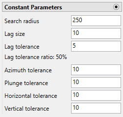 Constant Parameters allows you to use the same lag and tolerance parameters for all variograms. To set different lag and tolerance parameters for each variogram individually, see Directional Parameters below.